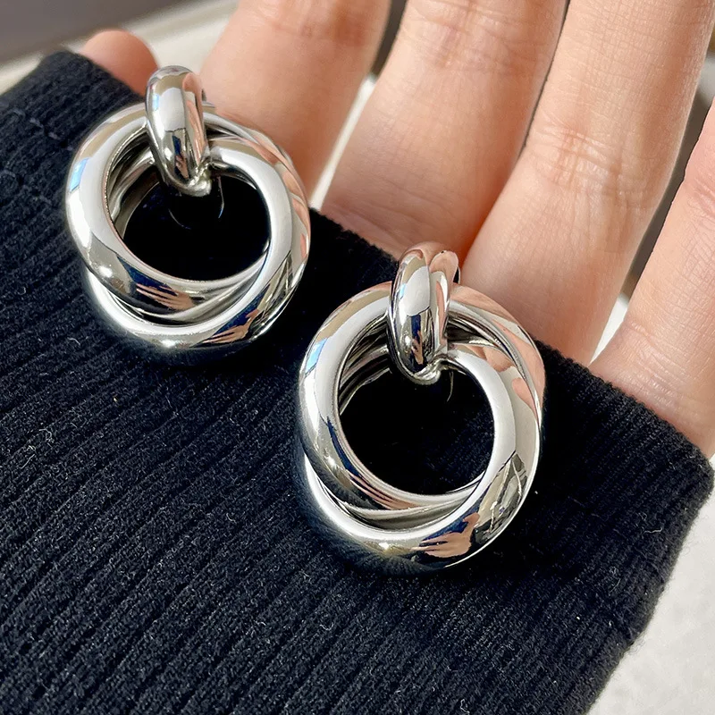 Double Layer Round Circle Dangle Earrings for Women Vintage Simple European Golden Metal Drop Earrings Geometry Jewelry