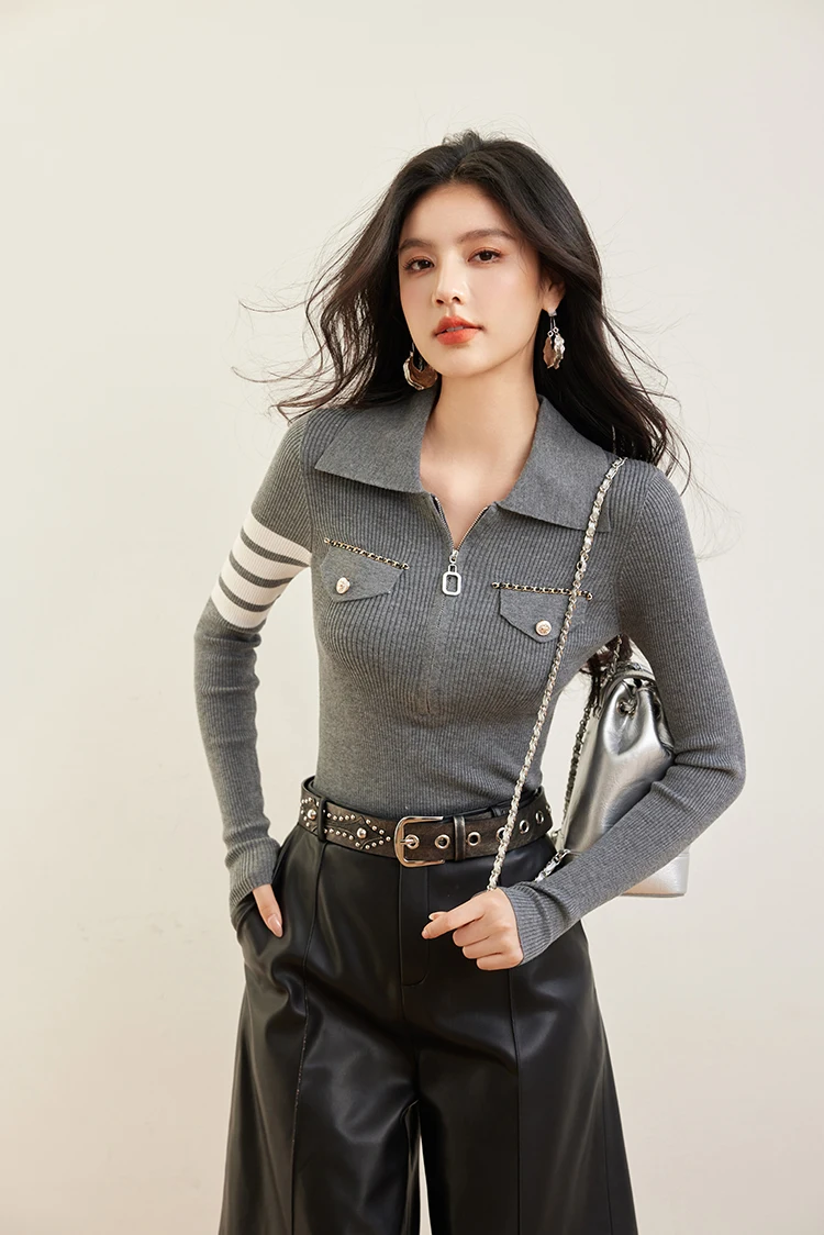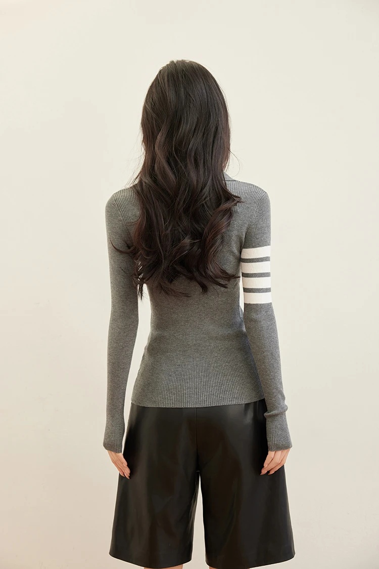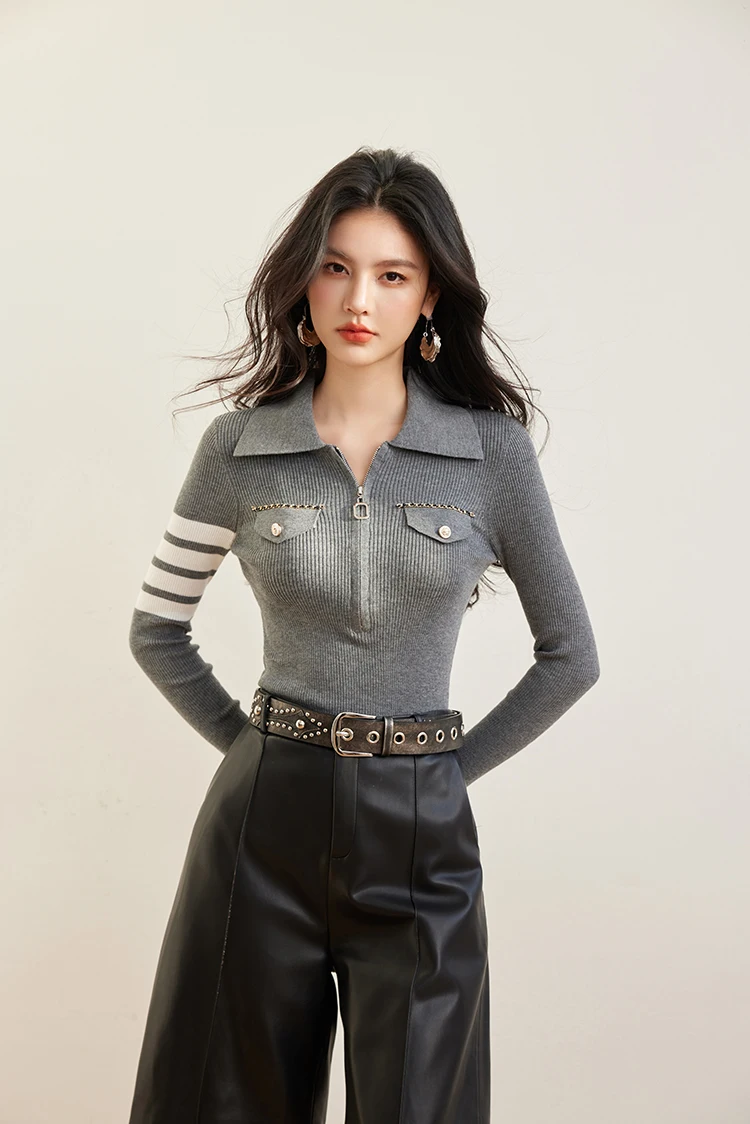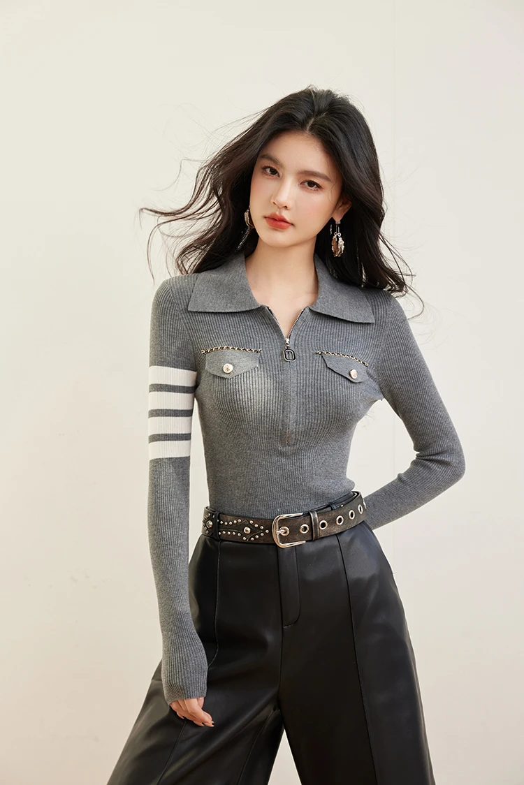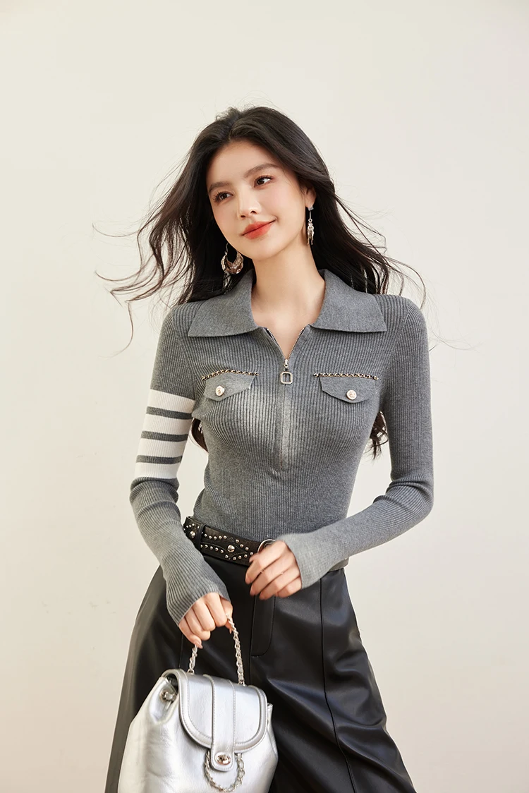 H Han Queen Spring Autumn Zipper Tops Slim Knitted Bottom Shirt Women's Sweater Striped Casual Knitted Pullover Sweater